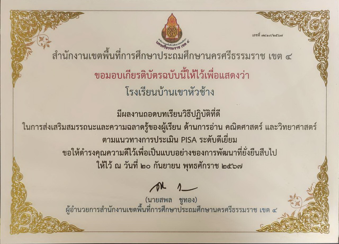 โรงเรียนบ้านเขาหัวช้าง ได้ส่งเสริมสมรรถนะและความฉลาดรู้ของผู้เรียน ด้านการอ่าน คณิตศาสตร์ และวิทยาศาสตร์ ตามแนวทางการประเมิน PISA อย่างมีประสิทธิภาพ |